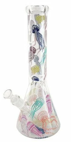 These glass water pipes stand 14 inches tall and features colourful jellyfish on the neck and a mermaid on the bottom of the beaker along with the Infyniti Glass logo. These beakers have a built-in 3-pinch ice catcher which makes for cooler, smoother hits. Includes a 14mm glass herb slide and removable downstem.