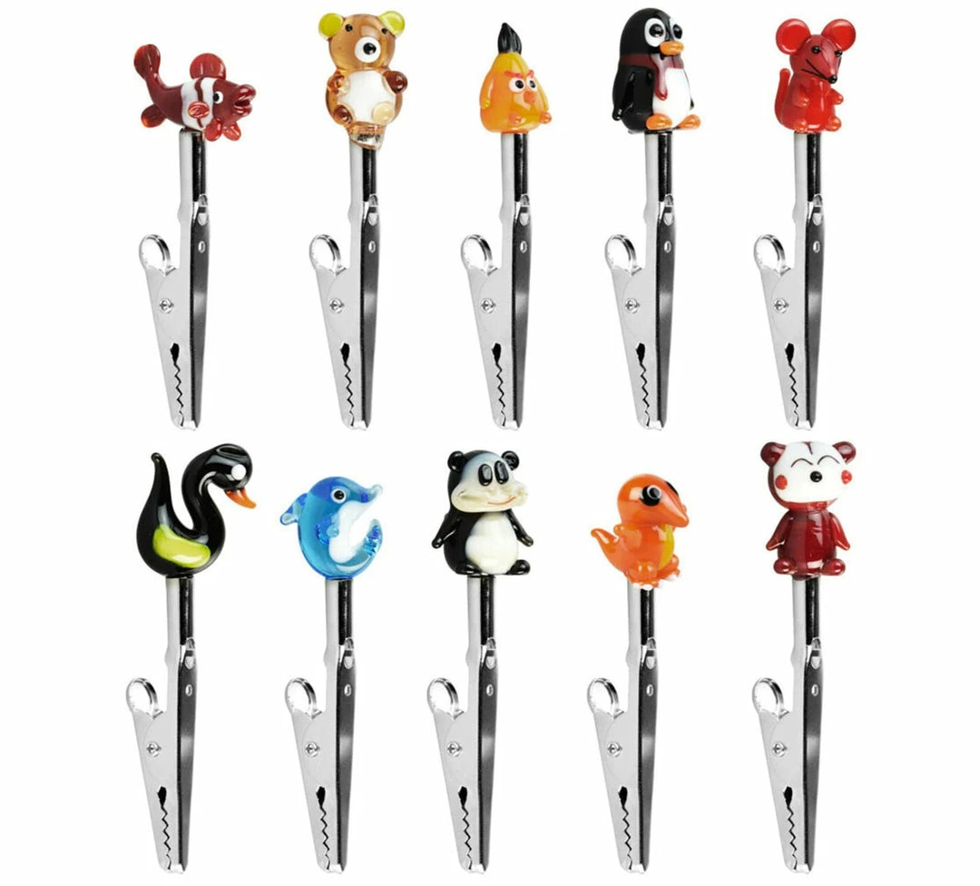 These small metal joint clips are perfect for holding your pre-rolled smokes during your smoke sesh. Each clip has a hand blown glass animal decoration on the end. Sold in AN assortment of colours. Clips measure approximstely 3 inches long.
