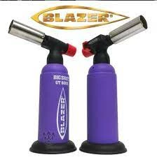 The GT8000 has an anti-flare, brass frame nozzle, for safety and flame control. Its design is intended for a low blow-out rate, when held in various positions, or where access is difficult, or space is limited. Its head is angled and it comes with an attachable, tabletop base for hands-free work. It features a gas-flow adjustment dial to control flame length. The Blazer dab torch houses a piezoelectric ignition system, which is based on a pressurized molecular reaction, and requires no electrical connection.