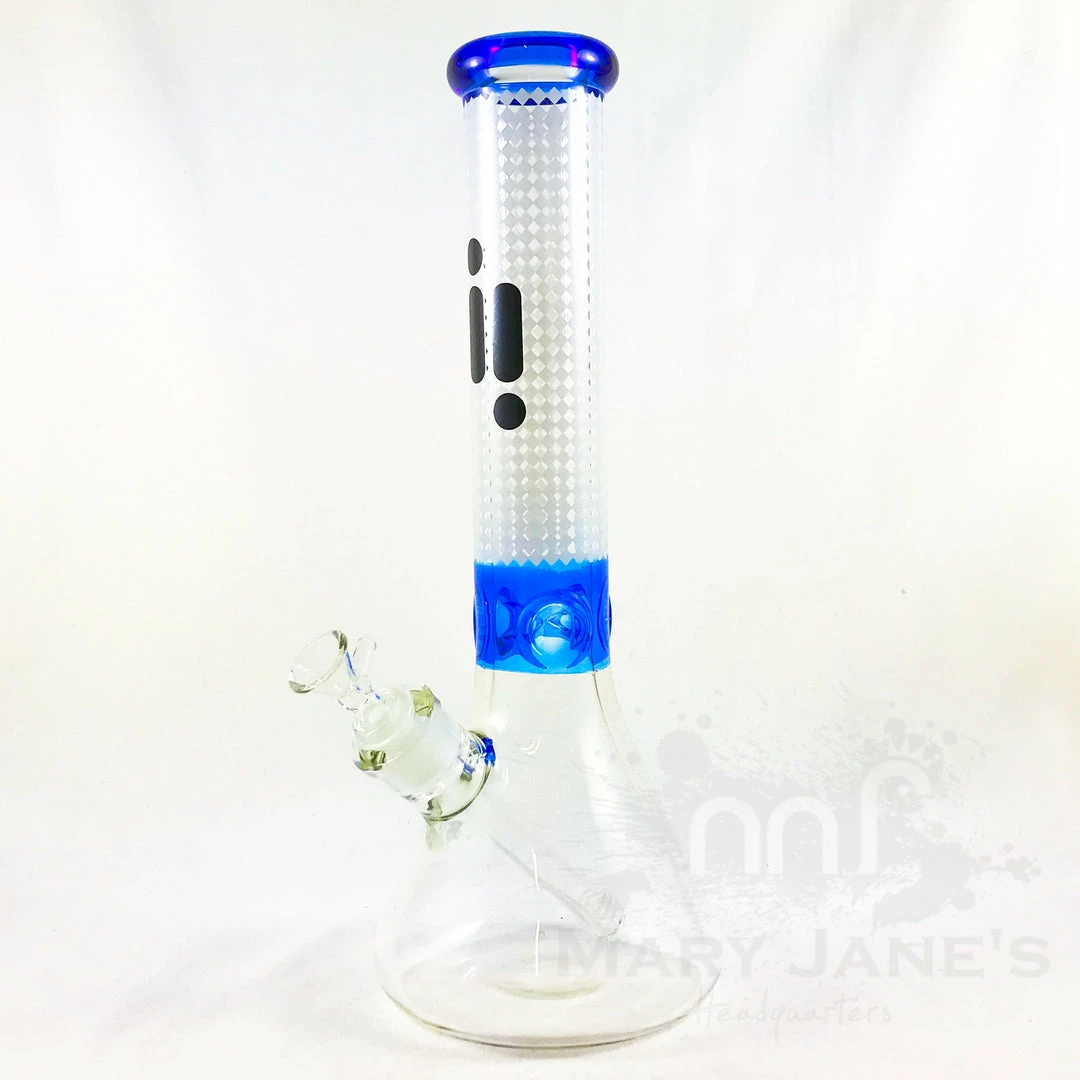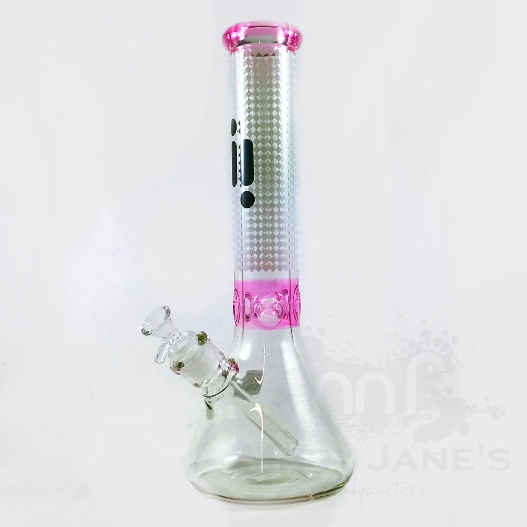 These glass water pipes stand 14 inches tall and feature a textured patterned neck with the Infyniti Glass logo. These beakers have a built-in 3-pinch ice catcher which makes for cooler, smoother hits. Made on 7mm tubing these water pipes includes a 14mm glass herb slide and removable downstem.