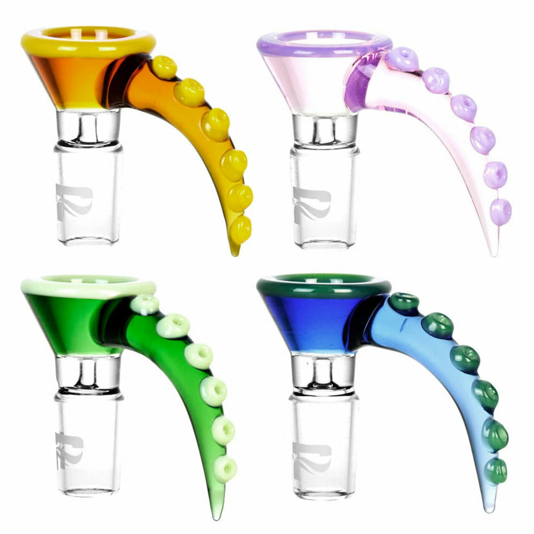 These Pulsar octopus tentacle bowls are made from quality coloured borosilicate glass. With an octopus tentacle style handle, users never have to worry about coming in contact with a heated bowl. Available with 14mm male or 19mm male joint sizes. Colours may vary from images.