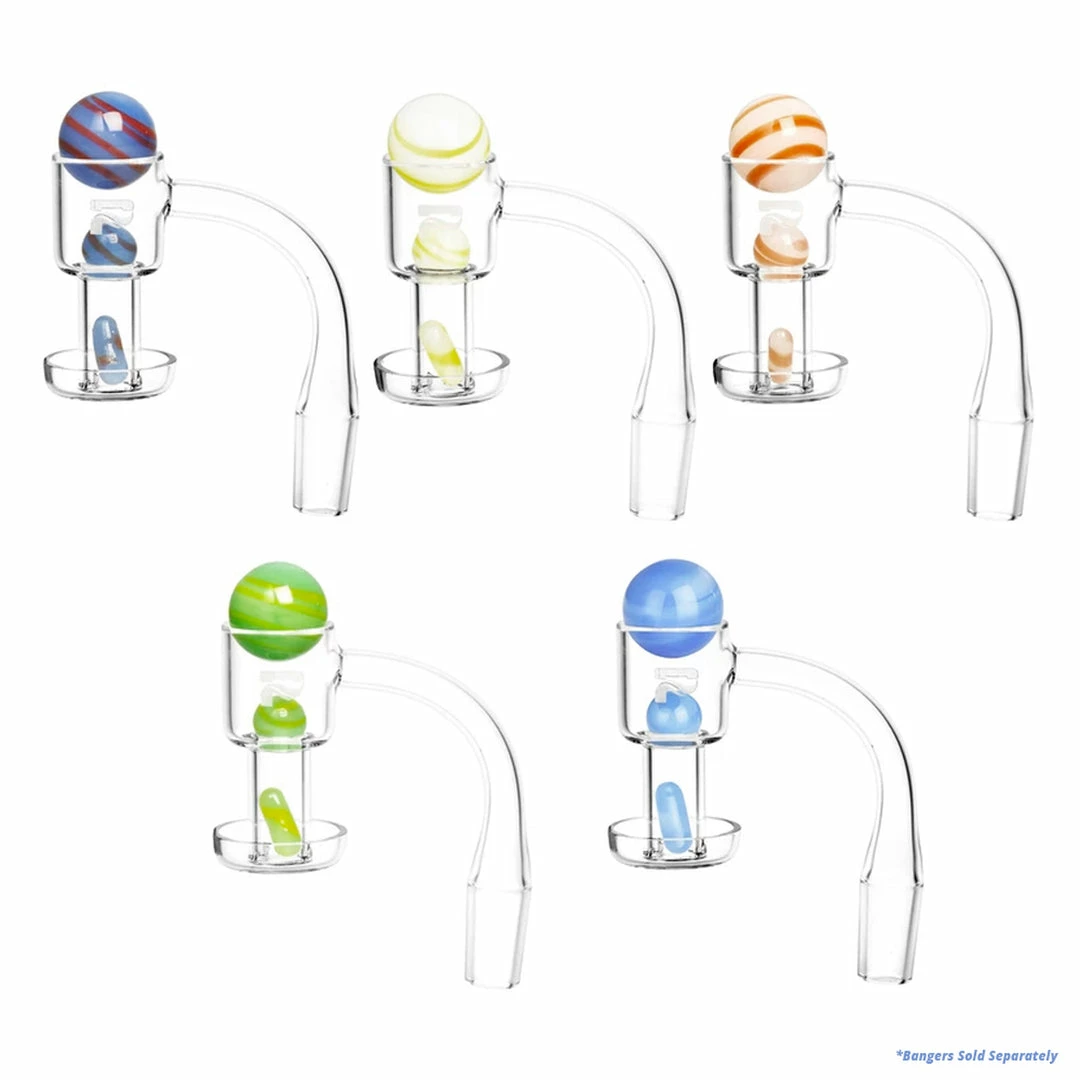 This 3 piece terp slurper marble and pill set includes a mixture of sizes that are perfect for use with a terp slurper banger. Terp marbles assist by stirring concentrates via airflow and regulating airflow as a marble cap. Multiple colour options available. Marble set approximate sizes are 22mm, 11.75mm, & 6mmx15.5mm. Please Note that the terp slurper bangers are sold separately and are shown for illustration purposes only.
