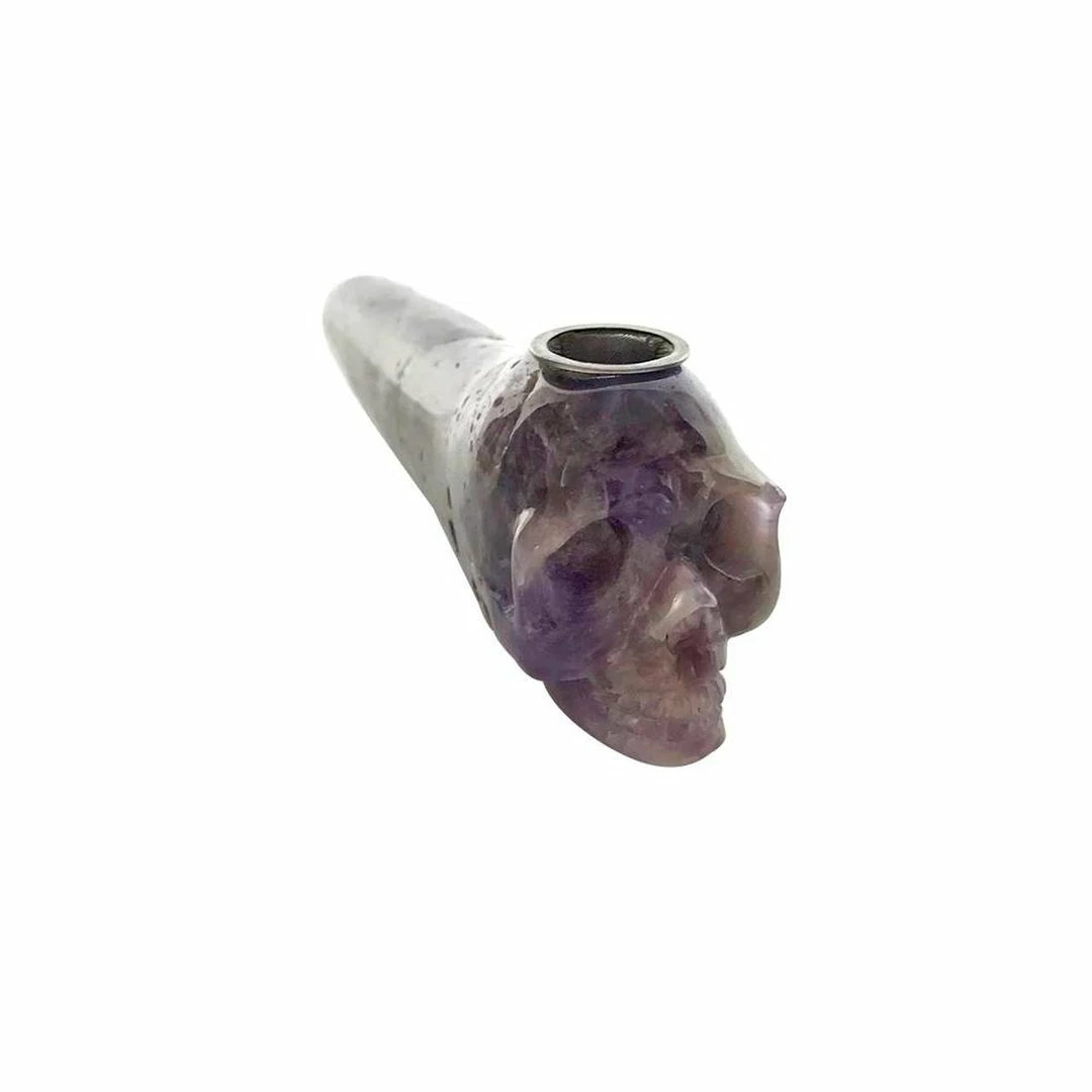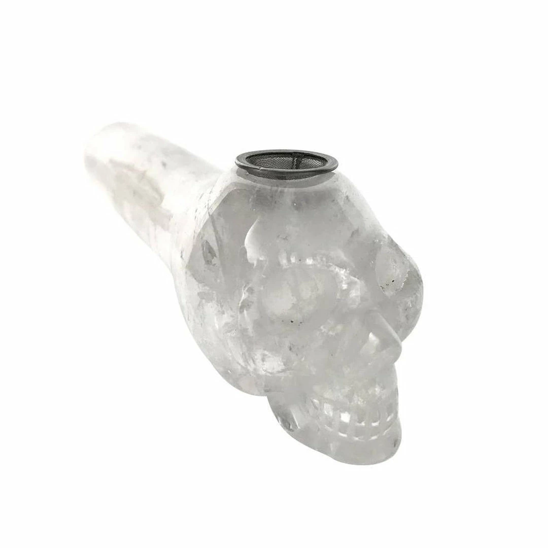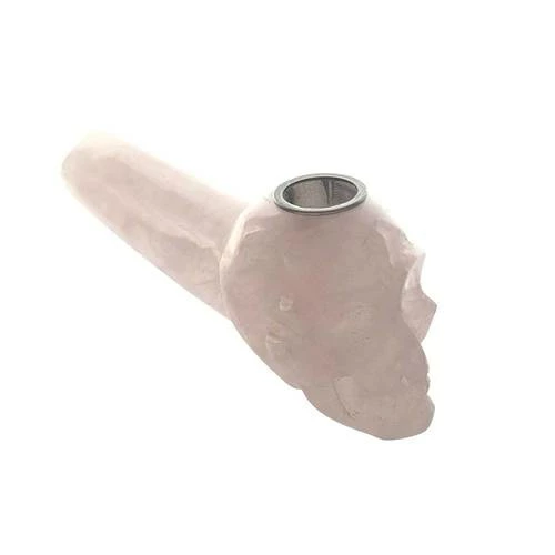 These handmade crystal pipes feature polished Clear Crystal. Amethyst Crystal or Rose Quartz Crystal that are shaped like a skull. The pipe includes a carb on the left and a removable screen bowl. Crystal pipes are great for healing and meditation and measure roughly 4″ in length.