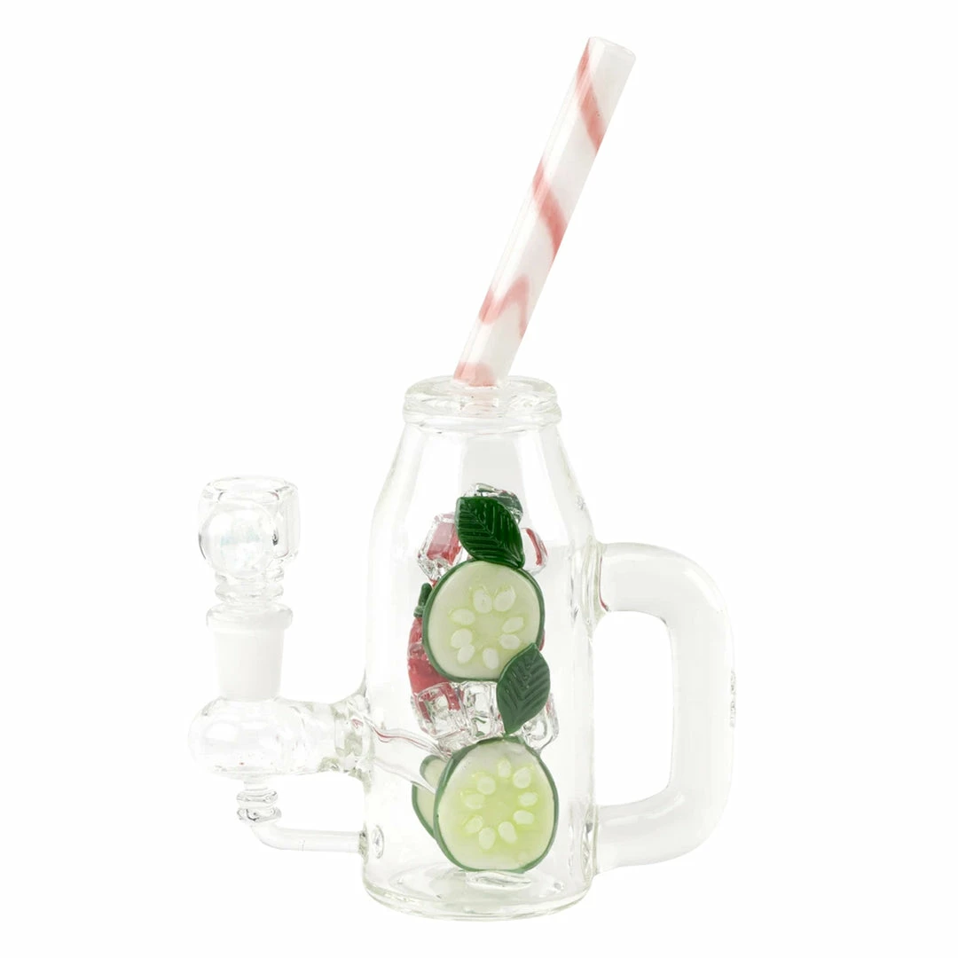 The icy strawberry cucumber detox water pipe is the new addition to the Empire Glassworks detox series. This refreshing design features a jar style worked body, blown with a strong glass handle that will make you forget you’re holding a water pipe and not an actual drink. Designed with a 14.5mm female ground joint on a reinforced banger hanger the ground joint leads down and out into the main chamber through a three-hole diffuser. The extended straw mouthpiece not only looks cool, it helps prevent back-splash through a small entrance hole, limiting space for water to pass.