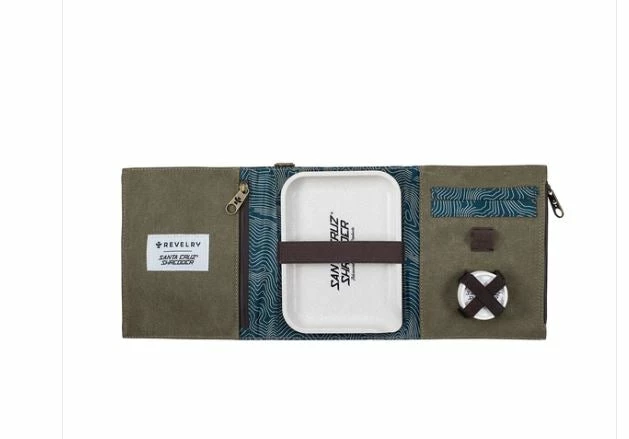 Revelry Supply, maker of stylish, discrete smell-proof bags has collaborated with their boardwalk neighbour Santa Cruz Shredder and the result is a portable rolling kit. The SCS + Revelry Supply collaboration kit combines a durable zippered lockable case incorporating water-resistant fabric, leather accents, metal hardware and a carbon filter system designed to hold a hemp rolling try, rolling papers, lighter and 2-piece Santa Cruz Shedder herb grinder. This rolling kit is a perfect piece of gear to stash in your pack whether your adventures take you around town or trekking the Grand Tetons.