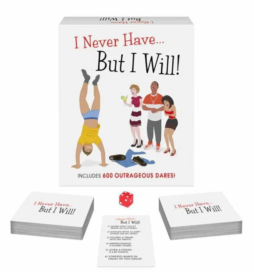 The crass party game with over 600 DARES! After an I Never Have statement is made, players indicate who of them have never done the action. The first of these players who announces, “But I Will” then acts out the dare and earns the card as a point. Play for points or as a drinking game! You can even offer a prize to the winner, such as candy, wine, a back rub, or a spanking! Includes: a die and 100 dare cards.