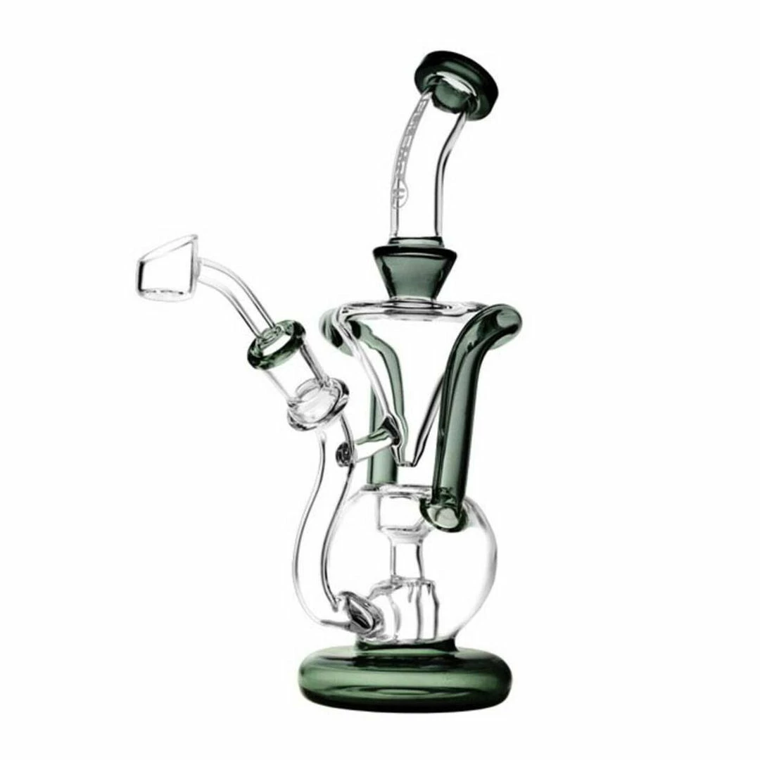 This Pulsar Gravity Ball Rig Recycler features an open cyclone drain that pours water out the bottom, through open-air and back into the perc chamber below. The water only drains when the user is not inhaling. Completely designed to prevent unwanted splashback. Stands 9.5 inches tall and comes with a quartz banger nail. Available in an assortment of colour options that may vary from what is pictured.