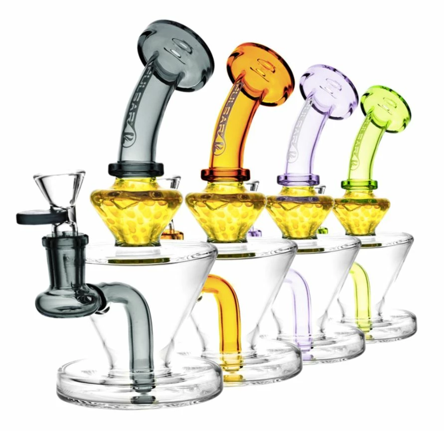 e Pulsar Honeycomb water pipe features a fixed diffuser downstem with a worked honeycomb glass accent. The rig stands 7 inches tall and features a 14mm female joint. Includes a 14mm male herb slide, but can be converted into the ultimate dab rig by adding a banger, carb cap and dab tool. Colours may vary from photos.
