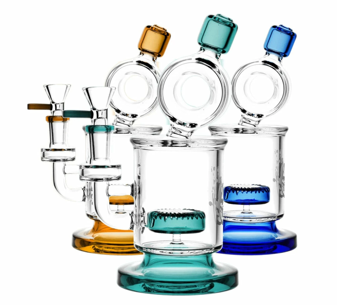This unique glass water pipe features a wide percolation chamber with a disc style perc and a donut shaped stem which prevents water from splashing back while using it. A fixed downstem with a 14mm female joint and comes with a 14mm male herb slide. This pipe is well-balanced on a thick round base.Â