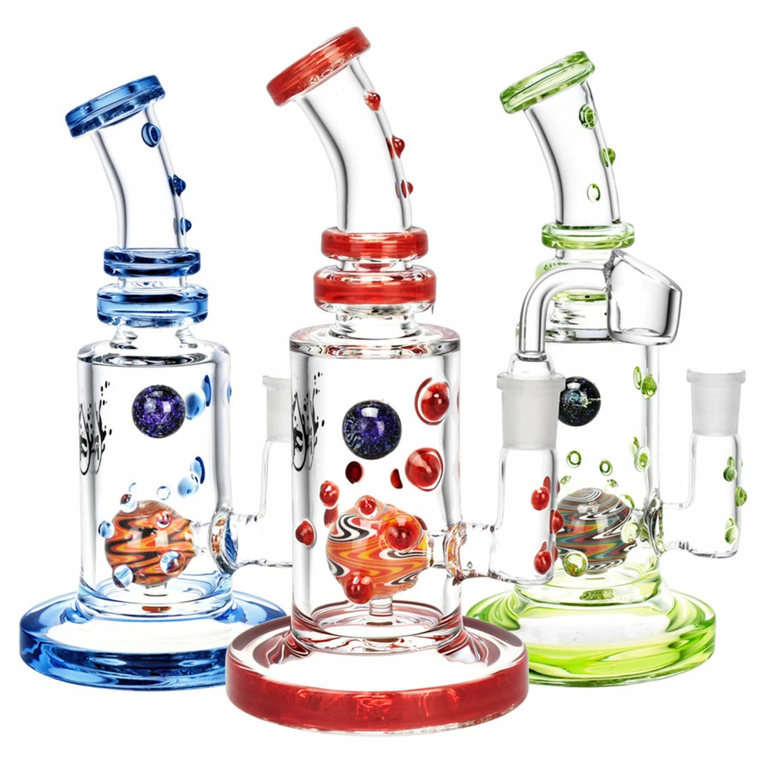 These quality glass Pulsar dab rigs come in a variety of bright assorted colour options. With dichro marble accents on the exterior and a wig wag design on the ball percolator, these water pipes brighten up any smoking zone. The angled mouthpiece makes accessibility easy and a 14mm male quartz banger is included with each pipe. Sold as assorted colours that may vary from images.