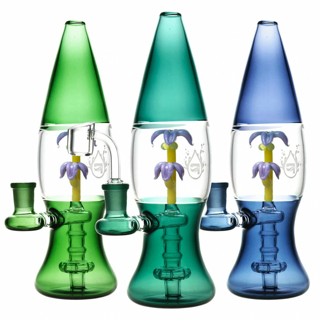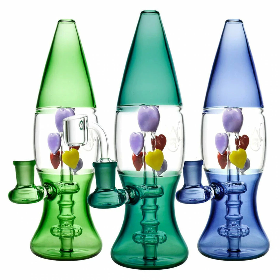 These Pulsar Hearts and Tropical Lava Lamp dab rigs stand 9 inches tall and feature a lava lamp style colour patterning and shape. These novelty pipes also have a showerhead percolator with either a multi-heart topper or tropical. Colours may vary from images.