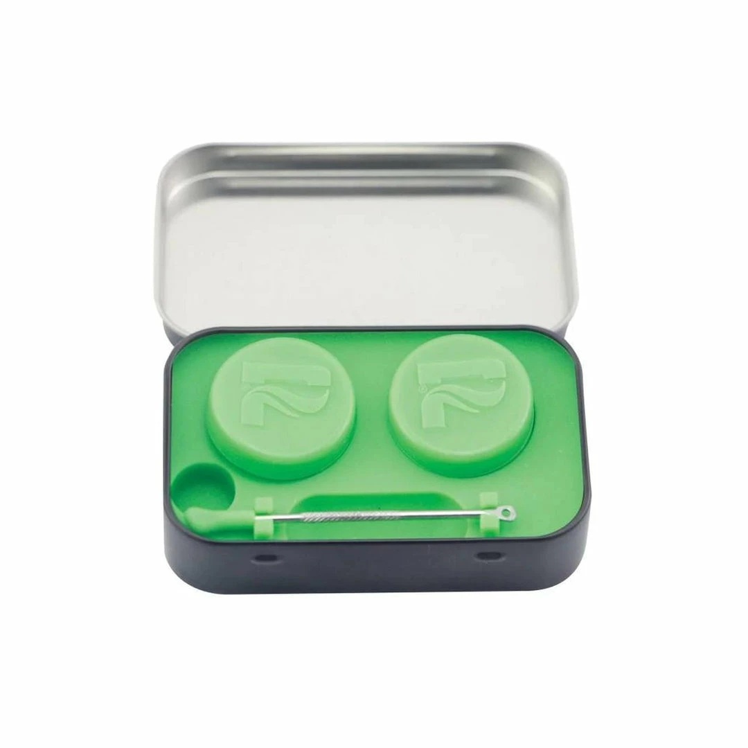 The concentrate tray kit is great for on-the-go use. Includes two food grade silicone concentrate containers, silicone tray, and stainless steel dab tool with silicone tip. The silicone containers each have a 3ml capacity and diameter measures 32mm. The tray has a space for setting a 14mm slide or nail. Everything comes enclosed in a metal tin measuring approx. 3.75″x2.5″x1.85″.