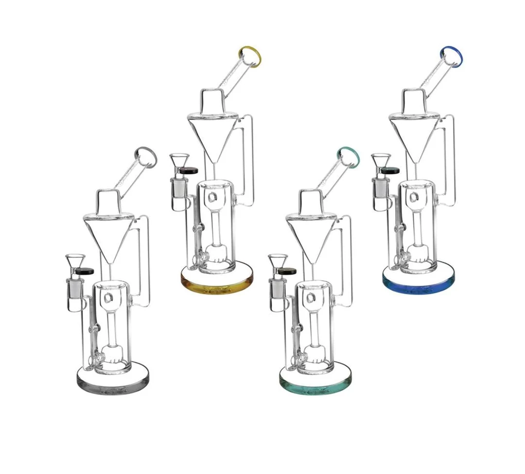 This Pulsar Gravity Recycler Waterpipe is 13″ tall and features a fixed  to disc perc and open cyclone drain. Unlike many other pipes, this one has a drain hole that pours out the bottom of the cyclone drain through open air and back into the perc chamber below. The water only drains when the user is not inhaling. Completely designed to prevent unwanted splashback. The  Dab Rig includes a matching herb slide and comes in assorted colours.