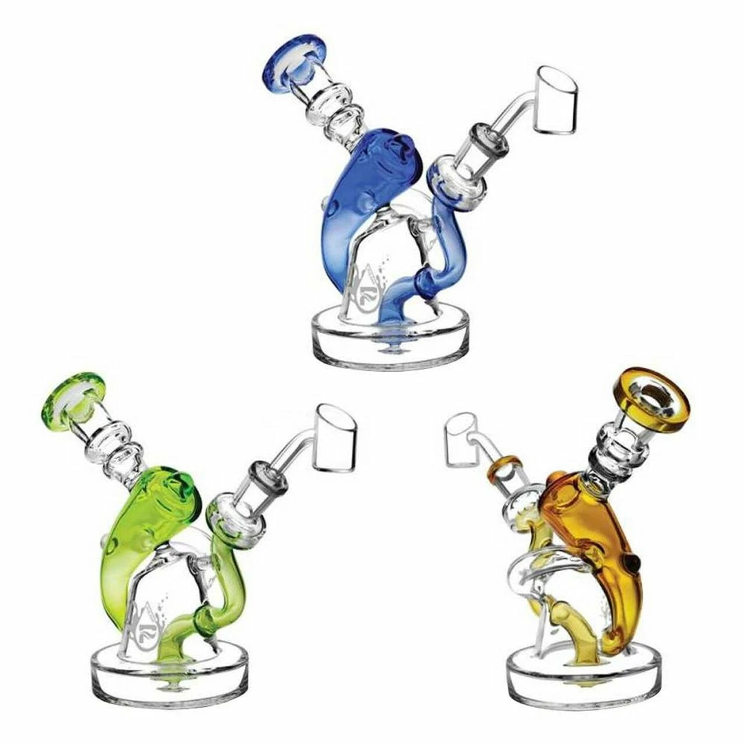 The Pulsar Mini Vortex Recycler Rig stands 6.5″ and features a diffused downstem, a single recycler tube, a no-splashback drain and colorful accents (assorted colors).