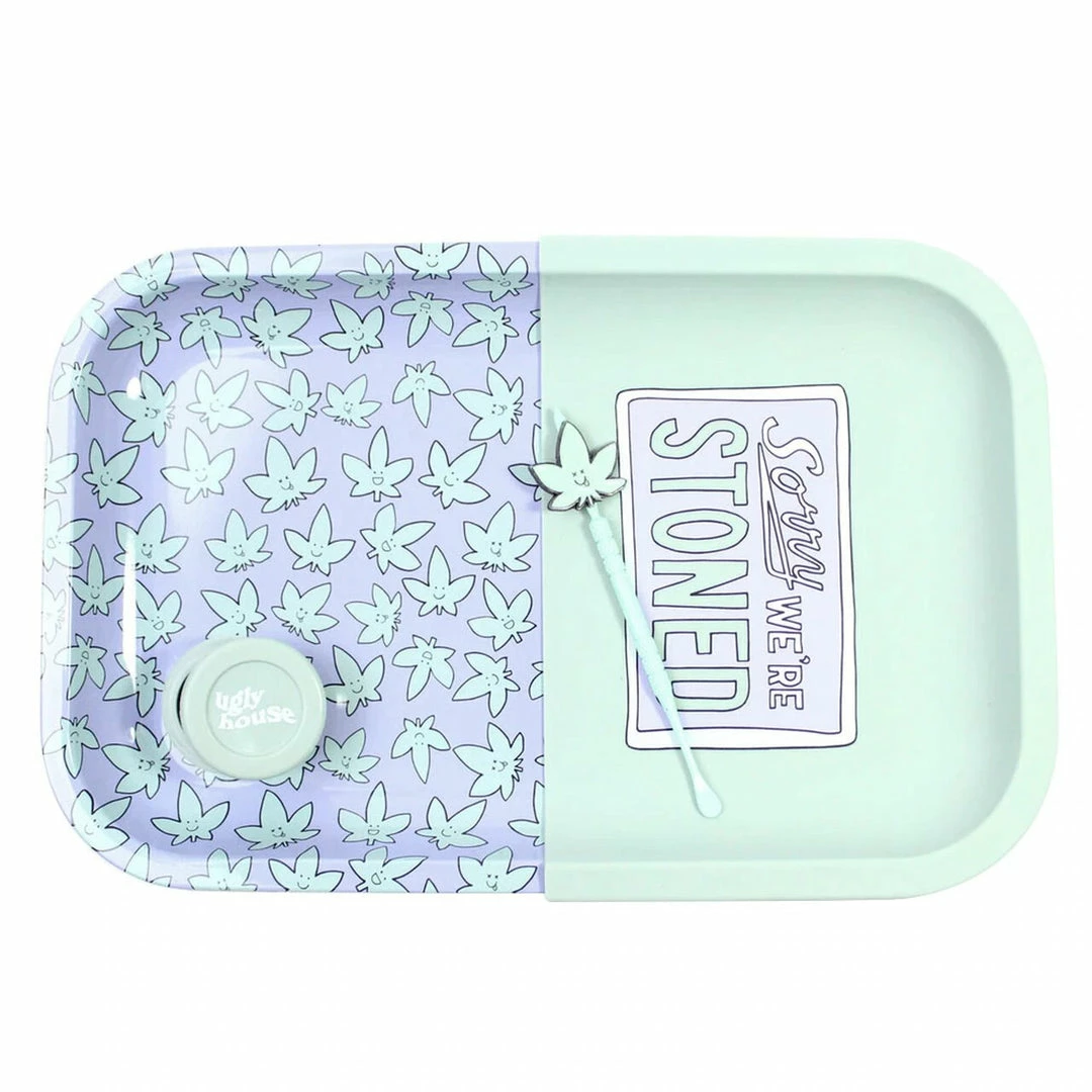 Ugly House dabbing kits consists of a silicone rolling tray, which is a metal rolling tray with a removable food-grade silicone, and matching silicone dab container and dab tool! The silicone dab mat holds sticky tools and doubles as a coaster for dab rigs. When you’re done with the silicone, simply remove and clean under lukewarm water. Replace the silicone on either side of the tray, or use the rolling tray on its own.Â