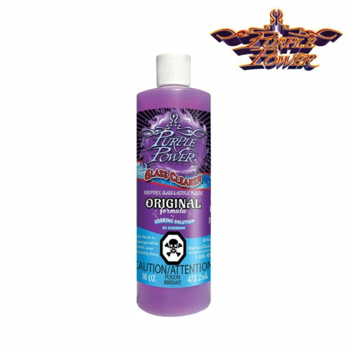 The Original Formula ‘Purple Power Soaking Solution’ 32oz has a longer soak time (45 minutes) than some other cleaners, but this is one of the few glass cleaners that is also safe to use on more delicate acrylic pieces. There are no brushes or picks required to work with this cleaning product. The cleaning is simple, and the product is re-usable and biodegradable.