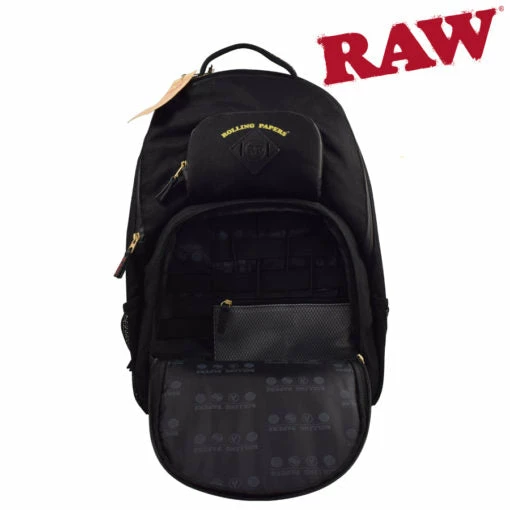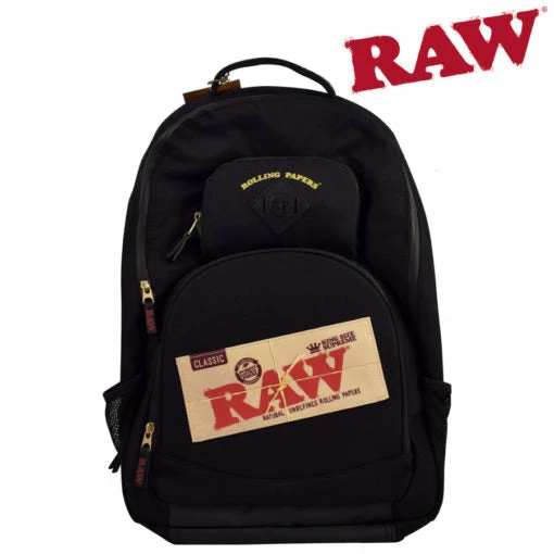 The ROLLING PAPERS x RAW Bakepack features 5 layer construction to be odour resistant, water resistant, and has spaces to carry all of your smoking needs!
