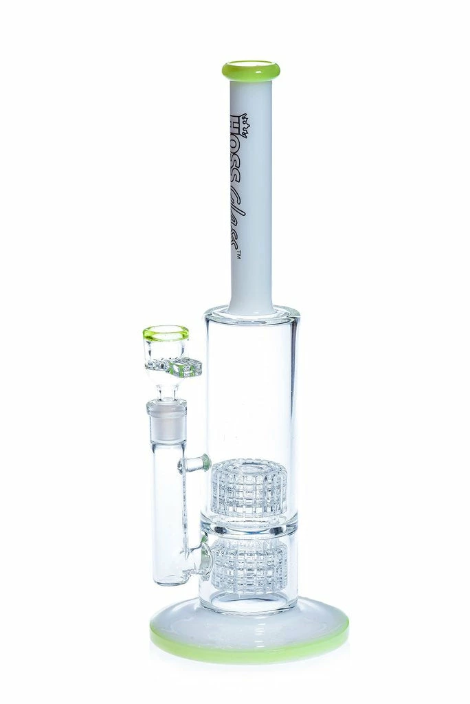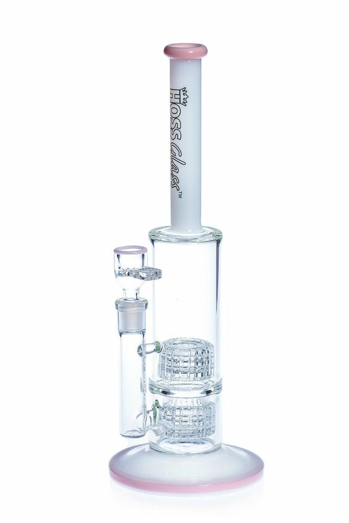 Double Grid Stemless with color accents. This beautiful stemless piece has two grid percolators that filter the smoke efficiently for a very smooth hit. The white glass with vibrant color accents gives it a very appealing look. Â