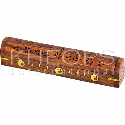 Our beautiful wooden incense storage box, with decorative brass inlays, burns incense sticks and has 2 brass plate insets for cone burning. It also has a storage compartment for keeping your favorite incense clean and safe. Stylish cut outs allow the incenses smoke to slowly escape and fill the air with your favorite scent. SYMBOL: Yin-Yang represents the two great opposite but complementary forces at work in the cosmos. Yin is the female principle, it is cold, dark, receptive, soft, small, and still. Yang is the male principle, it is bright, active, upward, hot, creative and strong. The shape of the yin and yang sections of the symbol give a sense of the continuous movement of these two energies, yin to yang and yang to yin. This movement is seen as the cause of all creation