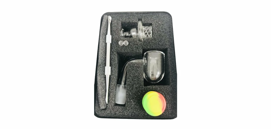 These excellent kits come with a round bottom 2mm quartz banger with a 14mm joint as well as two clear glass terp pearls equip with a clear spinner carb cap to make those pearls spin like crazy! Also comes with a mini silicone container and a stainless steel dual ended dab pick.