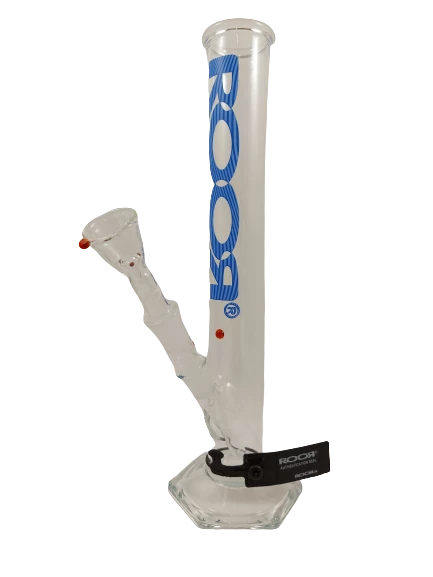 Clear straight tube Roor bong, with blue ROOR logo on the front