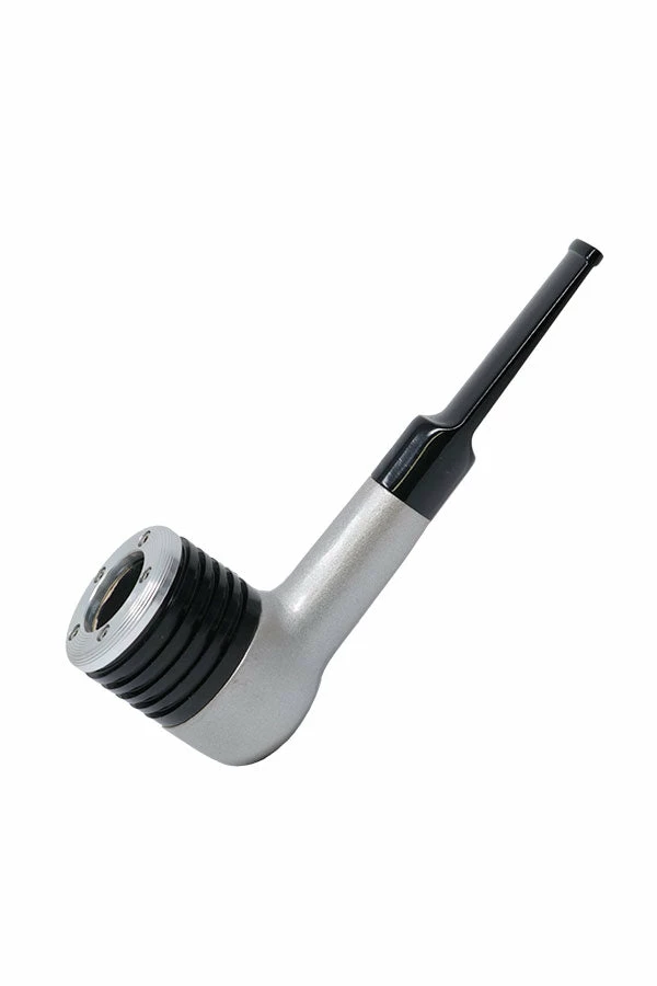 A Billiard-style wooden tobacco pipe with a smooth silver finish. It has a mortise and tenon connection with an activated carbon filter included. The bowl is wrapped in a wide black band with tactile ridges.