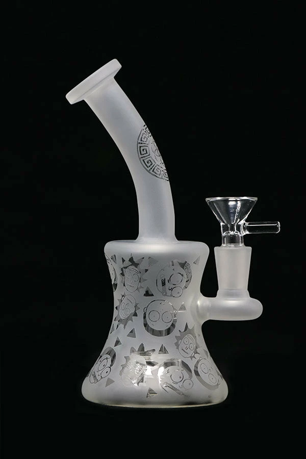 This is a fun piece featuring your favorite cartoon characters in a sandblast design. The glass has showerhead percolator and a herb bowl with a sleek roll stopper and enough windows to see the bubbling inside. The narrow neck tube gives a effective and smooth hit as the smoke exits the slightly flared mouthpiece.