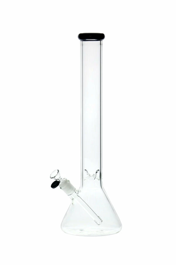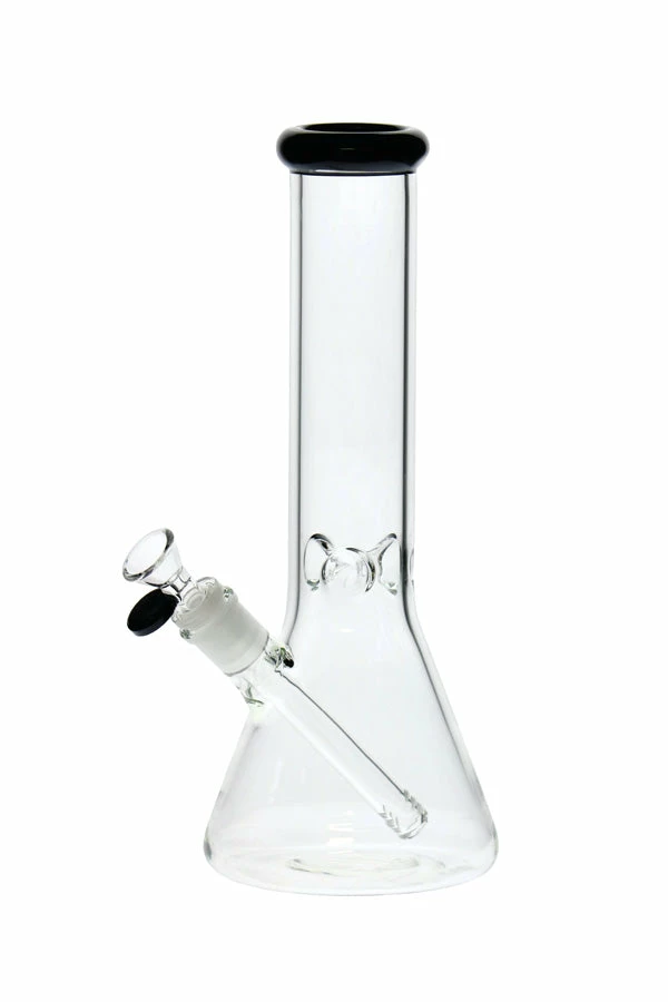 This classic “No Logo” beaker bong comes with ice notches and has a diffuser downstem and herb bowl. The rimmed mouthpiece is in coloured glass, creating it a strong contrast. This beaker is a perfect base for adding your preferred accessories to personalize it. Available in 12 and 18 inch versions.