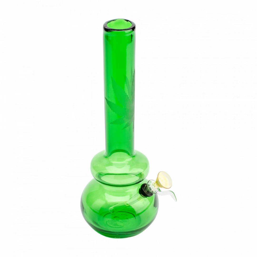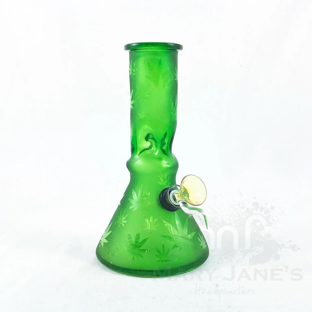 Feeling Retro? These old school style beaker bongs come in a 8″, 12″ and 16″ sizes. Featuring a vintage coke-bottle green glass, an old school pull out/downstem, and etched with your favorite plant leaves. This one is for the real weed lovers.