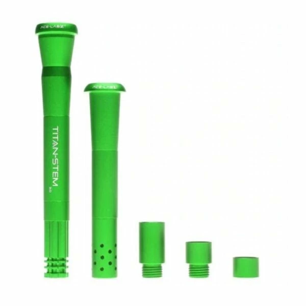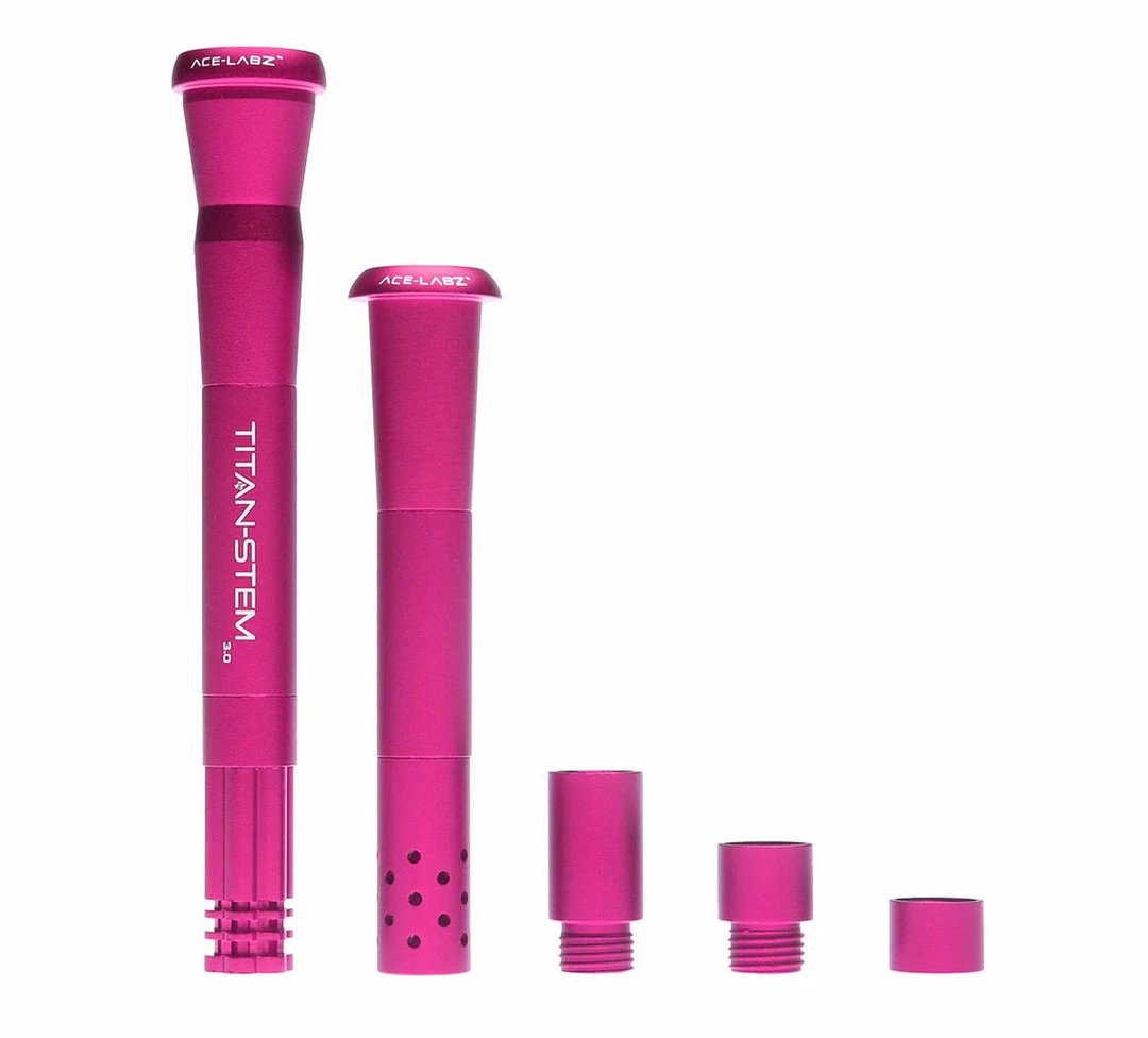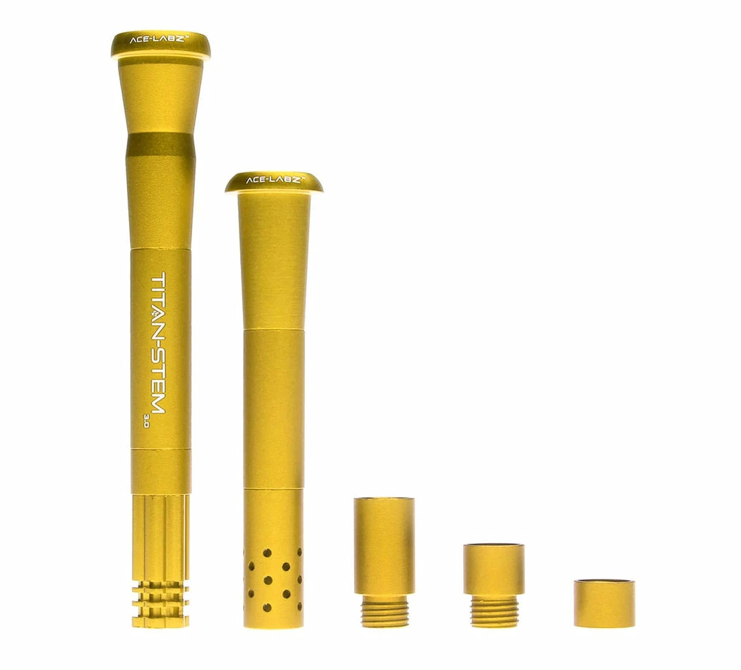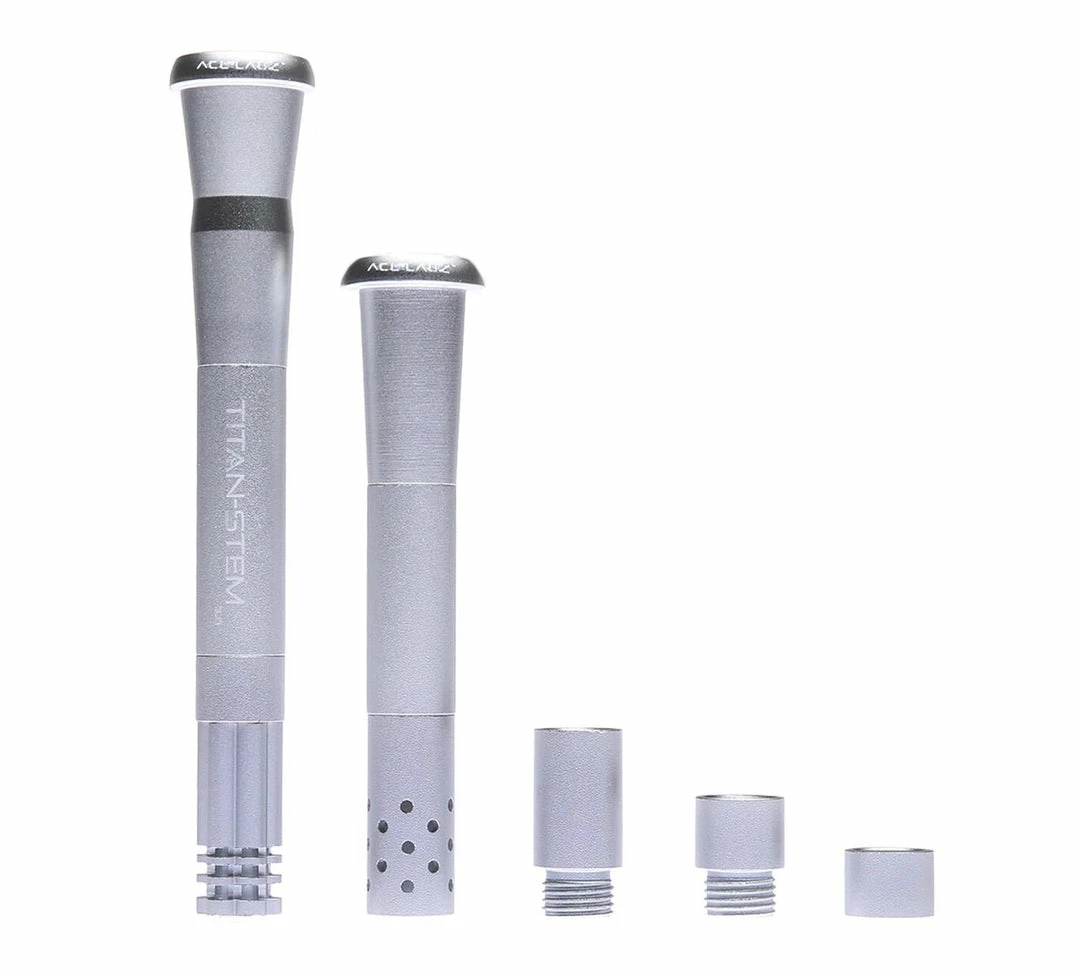 The Titan-Stem 3.0 from Ace Labz is the ultimate downstem solution for anyone who has clumsy friends, or if you yourself are a bit of a butter finger. Made from aircraft-grade aluminum, this stem will not shatter upon impact like your typical glass downstem. This beautiful anodized, non-stick finish makes the piece extremely easy to clean. Fully interchangeable and universal, you can use this downstem on any water pipe or concentrate rig with a 14mm or 19mm joint.Â