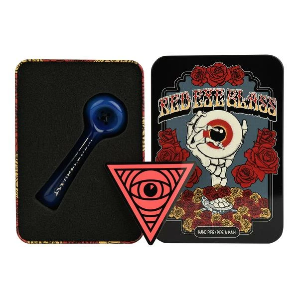 West Coast Gifts Red Eye Glass 4.5″ Hand Pipe With Built-In Screen & Ash Catcher Mouthpiece In A Collector Tin
